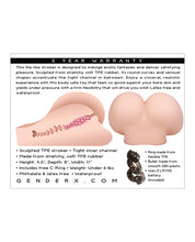This life-like stroker is designed to indulge erotic fantasies and deliver satisfying pleasure. Sculpted from stretchy soft TPE rubber, its round curves and sensual shapes accentuate the tight channel in between. Enjoy a visceral, realistic experience with this body safe toy that feels so good against your bare skin and yields under pressure with a firm flexibility that will drive you wild! Latex free and waterproof. Sculpted TPE stroker . Tight inner channel . Made from stretchy, soft TPE rubber . Includes free C-Ring . Height: 4.5, Depth: 8, Width: 11. Weight: Under 6 lbs . Phthalate and latex free . Waterproof. Five Year Warranty.