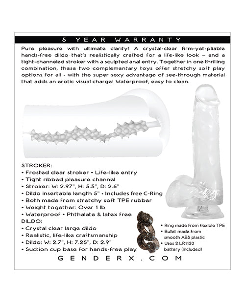Pure pleasure with ultimate clarity! A crystal-clear firm-yet-pliable hands-free dildo thats realistically crafted for a life-like look and a tight-channeled stroker with a sculpted anal entry. Together in one thrilling combination, these two complementary toys offer stretchy soft play options for all - with the super sexy advantage of see-through material that adds an erotic visual charge! Clear dildo & stroker set Dildo: Crystal clear large dildo Realistic, life-like craftsmanship Suction cup base for hands-free play Stroker: Frosted clear stroker Life-like anal entry Tight ribbed pleasure channel Dimensions: Dildo - Overall Length - 7.25 inches Insertable Length - 5 inches Width - 2.7 inches Stroker - Overall Length - 5.5 inches Width - 2.97 inches Material: Both made from stretchy soft TPE Five Year Warranty.