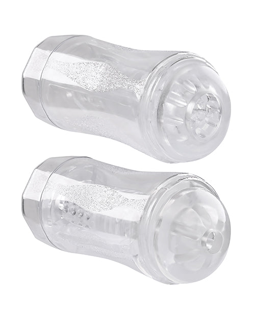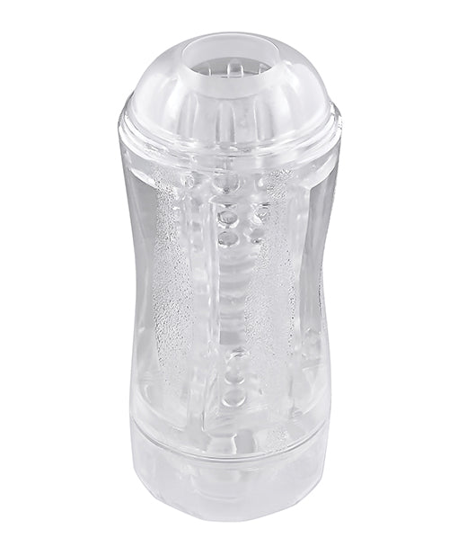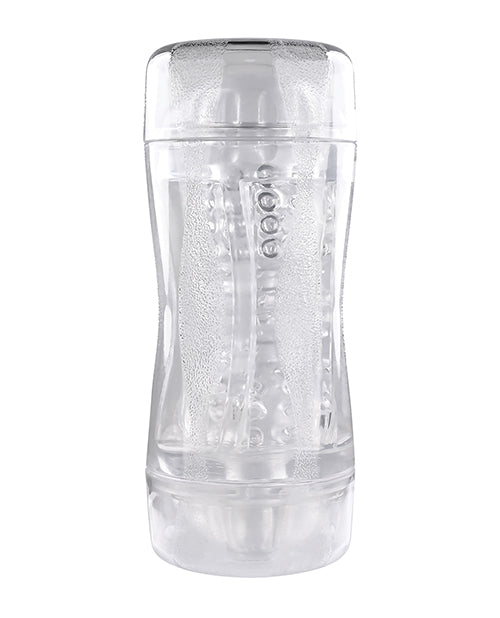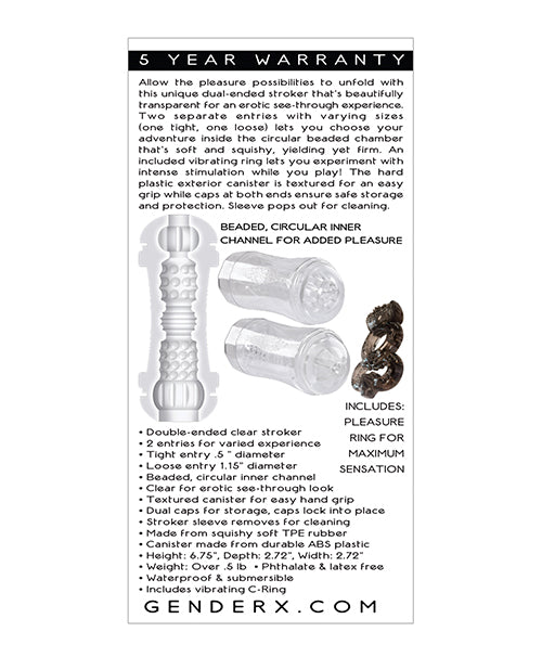 Allow the pleasure possibilities to unfold with this unique dual-ended stroker thats beautifully transparent for an erotic see-through experience. Two separate entries with varying sizes (one tight, one loose) lets you choose your adventure inside the circular beaded chamber thats soft and squishy, yielding yet firm. An included vibrating ring lets you experiment with intense stimulation while you play! The hard plastic exterior canister is textured for an easy grip while caps at both ends ensure safe storage and protection. Sleeve pops out for cleaning.