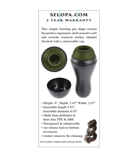 This simple bowling pin shape creates the perfect ergonomic shell around a soft and stretchy textured stroker channel finished with a removeable cap. Five Year Warranty.