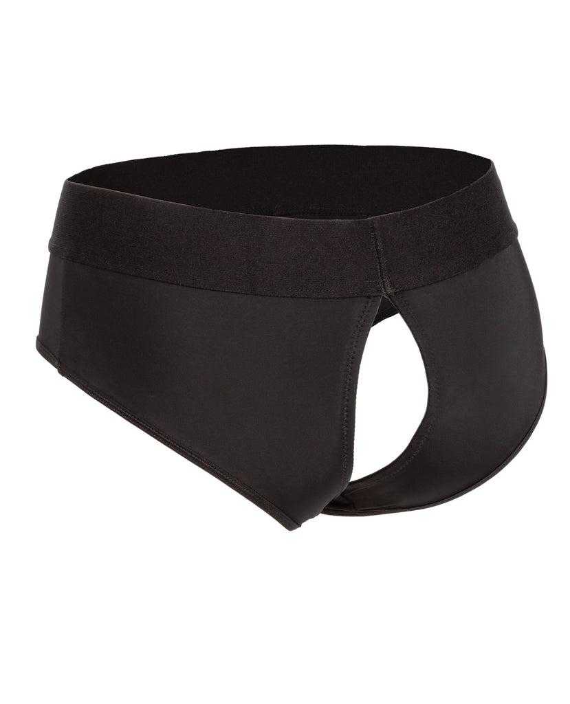The Boundless Backless Brief is an ultra-comfortable harness fashioned like a risqu backless brief with powerful performance and comfort in mind. This bold harness has an extra-wide waistband, soft stretchy fabric and reinforced O ring for the ultimate support. The durable, reinforced O-ring stretches to accommodate your favorite packer, vibrator or dildo. With a form-fitting design, this comfort harness can be worn discreetly under clothes. Enjoy pleasure made for two with the double panel interior for easy access to your favorite probe. Beginners and expert users alike will love frustration-free pleasure with this easy-to-wear harness. Simply secure your favorite probe, slip into the bold backless brief and dive deep into passionate penetration or enjoy comfortable all-day wear. Enjoy easy clean up by machine washing and hanging to dry. Size 2XL to 3 XL. One Year Warranty.