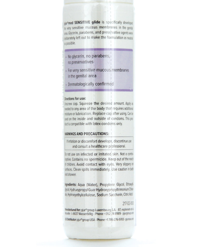 pjur med SENSITIVE glide is specifically developed for very sensitive mucous membranes in the genital area. Glycerin, parabens, and preservative agents were therefore deliberately left out to make the formula as neutral as possible thus ensuring maximum compatibility with mucous membranes. No preservatives, paraben & glycerin free. For very sensitive mucous membrane in the genital area.Dermatologically safe. Directions for use : Apply to any area of the body where extra moisture is desired. Suitable for daily use. Compatible with latex condoms. Ingredients: Aqua (Water), Propylene Glycol, Ethoxydiglycol, Hydroxypropyl Guar Hydroxypropyltrimonium Chloride, Hydroxyethylcellulose, Sodium Saccharin, Citric Acid.