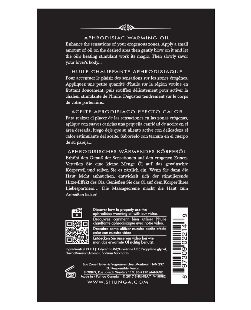 A delciious edible warming oil created especially to excite erogenous zones. Activate by the warm breath of soft intimate kisses. Perfect for use on the erogenous zones. Pour a small amount of the oil on the desired area and gently massage it into the skin. Softly blow on the oil to activate the product's heating properties. Use freely on any part of the body. Creamy Love Latte Ingredients (I.N.C.I.): Glycerin USP/Glycerine USP, Propylene glycol, Flavor/Saveur (Aroma), Sodium Saccharin.