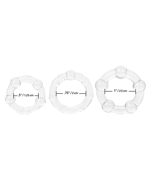 Ring the changes with the exotic Island Rings. The trio of stretchy erection enhancers put you in full control of your stamina maintenance and stimulation pleasure. The small, medium and large size all purpose cock rings are designed for extended intimate play and spontaneous satisfaction. Select your preferred enhancer, and enjoy tantalizing tingles of ecstasy and non-stop action. The rings are made from soft, smooth and flexible, transparent TPR and are adorned with sensuous pleasure beads and stimulation nodules, for enhanced orgasmic sensitivity. The exotic erection enhancers are designed to support stamina for prolonged performance. To use, choose your ring and slide it on to the erect penis so that it provides a secure fit at the base. Use a quality lube for increased sensations and unlimited enjoyment. Perfect for first time and experienced users, the Island Rings are easy to use and reusable so that you can enjoy endless encounters of the erotic kind. Use the enhancer rings for self-gratification exploration and during extended couples play. The rings can also be used alongside your favorite vibrating stimulation toys, for a mind-blowing climax experience every time. Remember to clean the stretchy support rings before and after every use. Wash in warm, soapy water or clean with a toy cleaner spray.