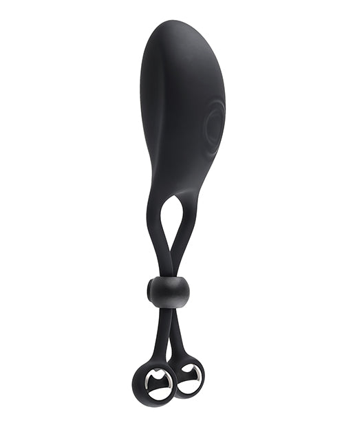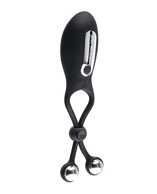 Introducing a unique ring design thats super comfortable and fiercely titillating. Adjustable silicone straps tie around you like a drawstring and finish with two stainless-steel balls that dangle and massage as they move. The chunky centerpiece features a powerful tapping motor that stimulates in 10 glorious speeds wherever you place it - and the 1-button control is nestled into a stylish chrome-finished plate. Enjoy your long-lasting pleasure underwater as its completely submersible, easy to clean, and recharges via USB. Five Year Warranty.