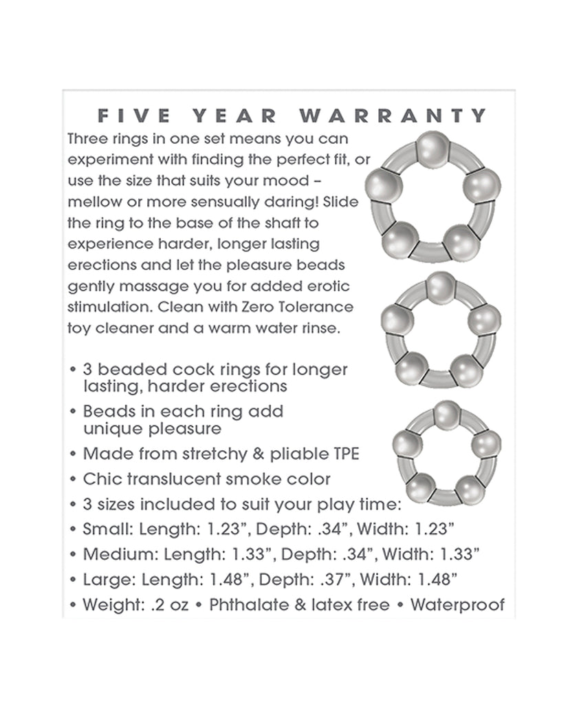 Three rings in one set means you can experiment with finding the perfect fit, or use the size that suits your mood - mellow or more sensually daring! Slide the ring to the base of the shaft to experience harder, longer lasting erections and let the pleasure beads gently massage you for added erotic stimulation. Features 3 beaded cock rings for longer lasting, harder erections. Beads in each ring add unique pleasure. Material: TPE 3 sizes included to suit your play time. Small ring length 1.23 inches, depth .34 inch, width 1.23 inches. Medium ring length 1.33 inches, depth .34 inch, width 1.33 inches. Large ring length 1.48 inches, depth .37 inch, width 1.48 inches. 5 year warranty.