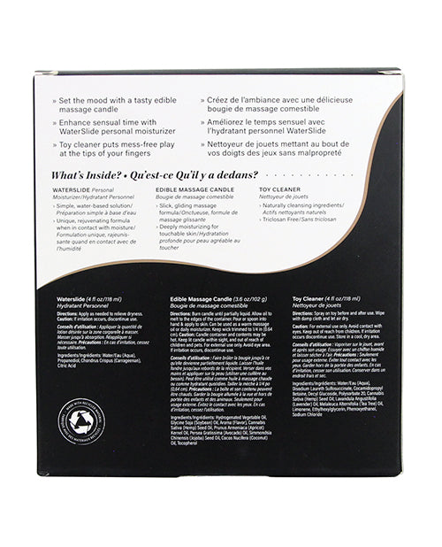 Our Play & Pleasure set includes the basics you’ll need for any fun fantasies you want to explore and enjoy. WHAT’S INSIDE? Waterslide Personal Moisturizer Our Waterslide is the simplest, purest personal moisturizer. This unique formula that includes water and carrageenan rejuvenates when it comes into contact with moisture, whether it be your own natural lubrication or saliva ensuring that one application will last through any night. With just four ingredients, Waterslide provides a slick glide with minimal irritants, making it ideal for those with increased sensitivities. 3-in-1 Edible Massage Candle Our 3-in-1 Edible Massage Candle melts down into a sensual massage oil with a subtle hint of flavor when licked off. It is specially formulated to melt a couple of degrees above body temperature to keep things warm as it seeps into the skin. Its unique blend of natural oils provides a professional slip that moisturizes skin and gives it a healthier-looking glow. Toy Cleaner Our Toy Cleaner is an essential product for keeping you and your toys clean and well cared for, so you can have the freedom to enjoy yourself with or without a partner. Essential oils like Tea Tree, Lavender, and Hemp Seed act as advanced cleaning agents to keep your toys and your skin ultra-clean, soothed, and irritation-free. It is a safe and effective way to clean toys before and after use, so they’re always ready for action.