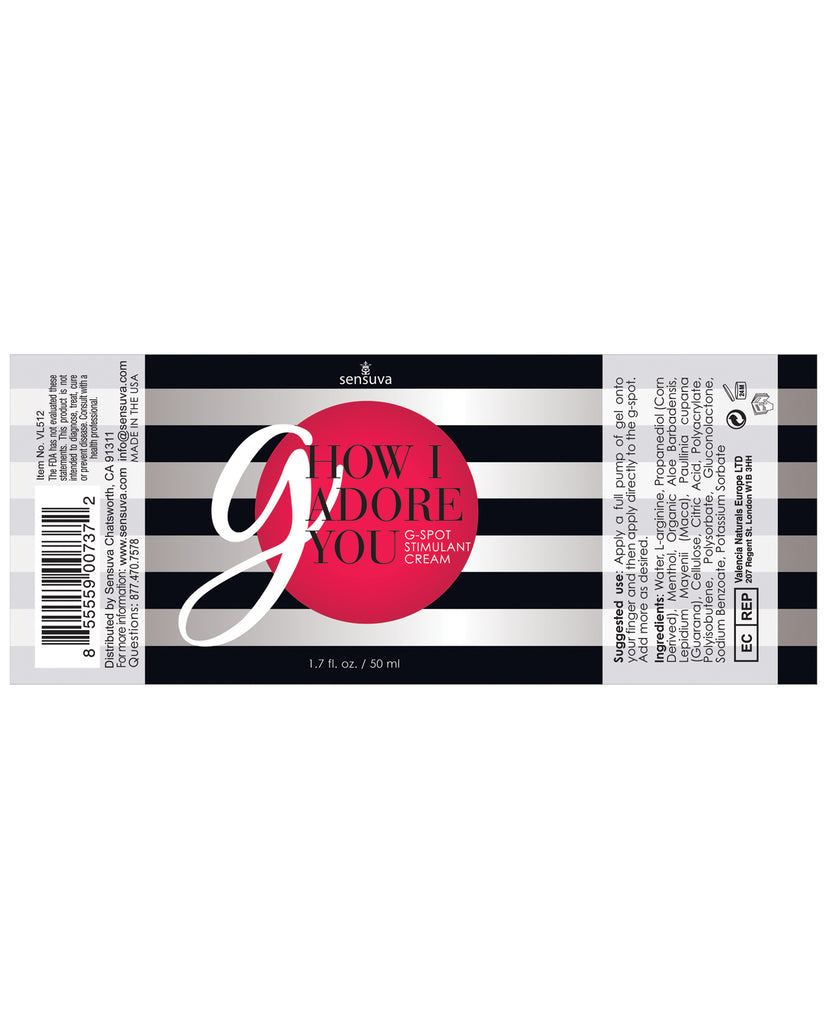 G, How I Adore you is a new, exciting enhancement gel that helps women find their own g-spot and enjoy more g-spot orgasms! massage it directly onto the g-spot to increase blood flow and sensitivity. With more stimulation, the g-spot area may become more pronounced and accessible during manual play or penetration, giving women more pleasure and possibly triggering a g-spot orgasm. G, How I Adore You G-Spot Stimulant Cream is made with healthy ingredients and natural arousal supplements such as L-Arginine, MACA, Guarana, and Menthol. It is also hydrating and pH balanced to compliment a woman's body!
