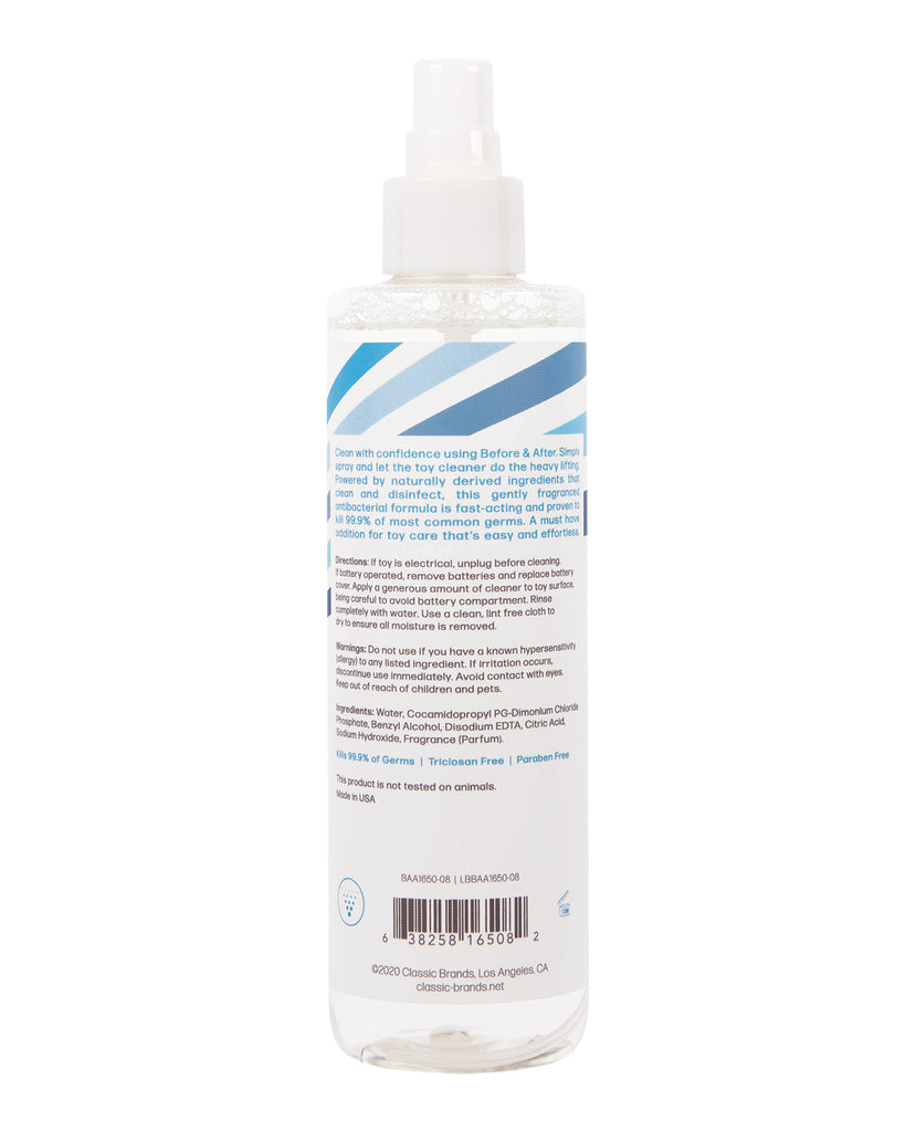 Clean with confidence using Before & After. Simply spray and let the toy cleaner do the heavy lifting. Powered by naturally derived ingredients that clean and disinfect, this gently fragranced, antibacterial formula is fast-acting and proven to kill 99.9% of most common germs. A must have addition for toy care that’s easy and effortless. Powered by naturally derived ingredients. Proven to kill 99.9% of germs. Anti-bacterial formula is easy to apply and fast activing. Triclosan Free Paraben Free. This product is not tested on animals. Made in USA. INGREDIENTS: Water (Eau/Aqua), Cocamidapropyl PG-Dimonium Chloride Phosphate, Benzyl Alcohol, Disodium EDTA, Citric Acid, Sodium Hydroxide, Fragrance (Parfum).