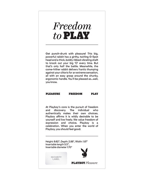 Get punch-drunk with pleasure! This big, powerful rabbit features a girthy, twirling G-spot head and a thick, boldly ribbed vibrating shaft to knock out your big O every time. Meanwhile, the come-hither rabbit delivers frantic thumping against your clitoris for an extreme sensation, all with an easy grasp around the chunky, ergonomic handle. Five Year Warranty.