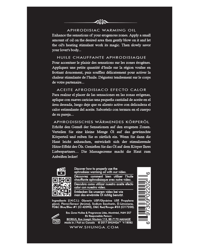 A delciious edible warming oil created especially to excite erogenous zones. Activate by the warm breath of soft intimate kisses. Perfect for use on the erogenous zones. Pour a small amount of the oil on the desired area and gently massage it into the skin. Softly blow on the oil to activate the product's heating properties. Use freely on any part of the body. Exotic Fruit Ingredients (I.N.C.I.): Glycerin USP/Glycerine USP, Propylene glycol, Flavor/Saveur (Aroma), Sodium Saccharin, D-Limonene, FD&C Blue/Bleu #1 (CI 42090), D&C Red/Rouge #33 (CI17200). .