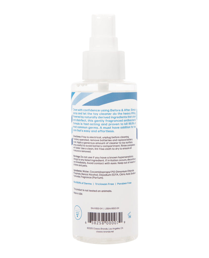 Clean with confidence using Before & After. Simply spray and let the toy cleaner do the heavy lifting. Powered by naturally derived ingredients that clean and disinfect, this gently fragranced, antibacterial formula is fast-acting and proven to kill 99.9% of most common germs. A must have addition for toy care that’s easy and effortless. Powered by naturally derived ingredients. Proven to kill 99.9% of germs. Anti-bacterial formula is easy to apply and fast activing. Triclosan Free Paraben Free. This product is not tested on animals. Made in USA. INGREDIENTS: Water (Eau/Aqua), Cocamidapropyl PG-Dimonium Chloride Phosphate, Benzyl Alcohol, Disodium EDTA, Citric Acid, Sodium Hydroxide, Fragrance (Parfum).