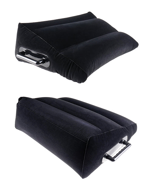 Indulge in your wildest fantasies with this Inflatable Position Master. The slanted, flocked design allows you to relax in any position without sliding off, while the EZ-Grip love handles are perfect for maintaining difficult positions without losing your rhythm. The air seal valve makes inflating the wedge a snap, and when the fun is over, simply deflate the Position Master and it's ready to go where you go. It's perfect for those romantic getaways and no one will know whats in your bag! Do it all with greater ease...no matter what position you're in! And lubricant doesn't even show up on the surface making it easy to clean, too! Holds up to 300 lbs. Inflated dimensions are 8" tall tapering down to 3" tall, 16" long, end to end, and 23" wide. Includes: Inflatable Position Master with EZ-Grip Handles