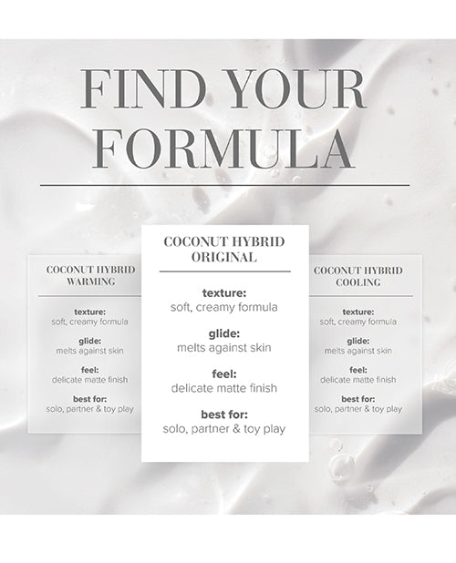 JO Coconut Hybrid lubricant is our unique blend of premium coconut oil and water-based ingredients. It offers a rich glide that melts against the skin for the perfect slide during solo, partnered, and toy play. Its soft, creamy formula absorbs naturally for a nourishing and delicate finish thats never greasy or oily. Key ingredients. Cocos Nucifera (Coconut) Oil is a natural antioxidant and moisturizer. Not compatible with polyurethane condoms.