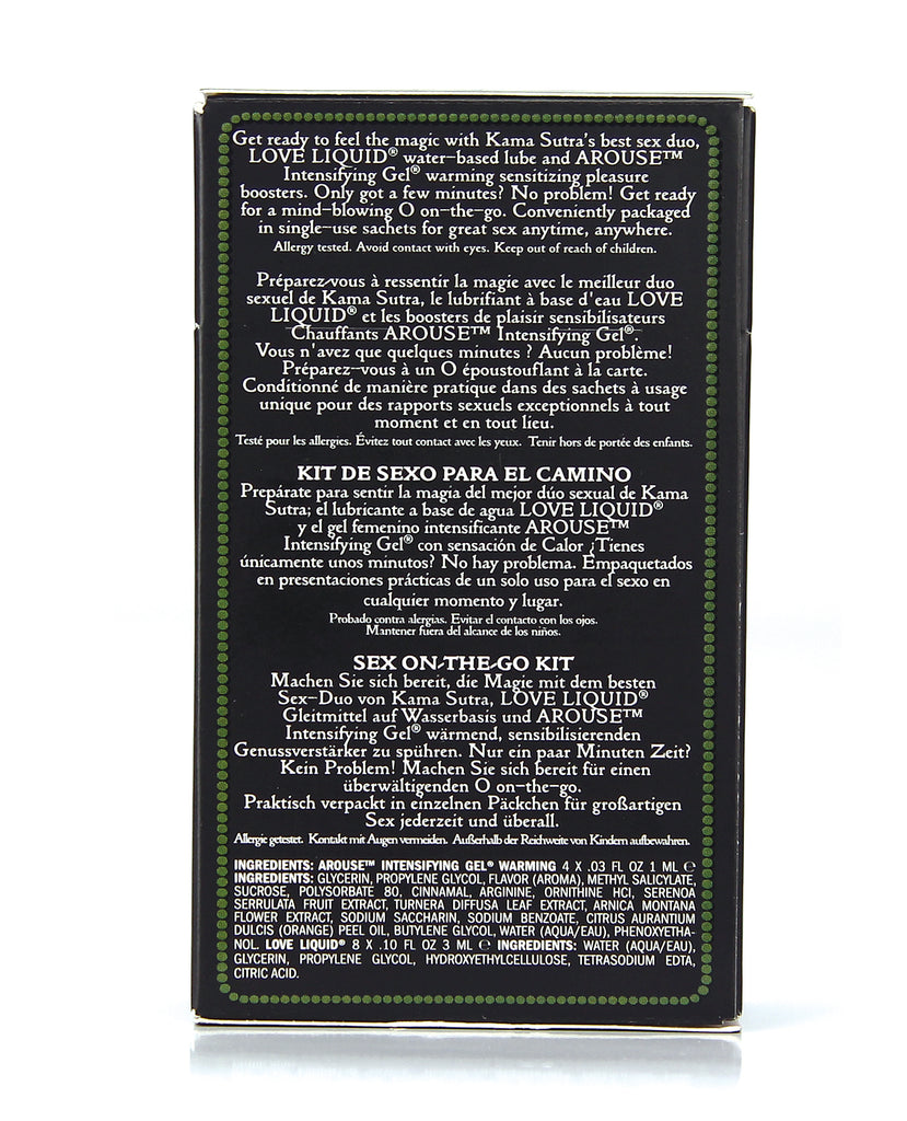 Sex-to-Go Kits from Kama Sutra: Sex Magic Sex to Go Kit. Conveniently sized to fit discreetly into a pocket or purse. Contains an assortment of single-use sachets for a quickie anytime, anywhere. Sex Magic Kit contains: 4 Arouse Intensifying Gel Warming Sachets - Clitoral Sensations Gel. 8 Love Liquid Sachets - water based lube. Multi-Lingual Informational Brochure with tips and sex positions.