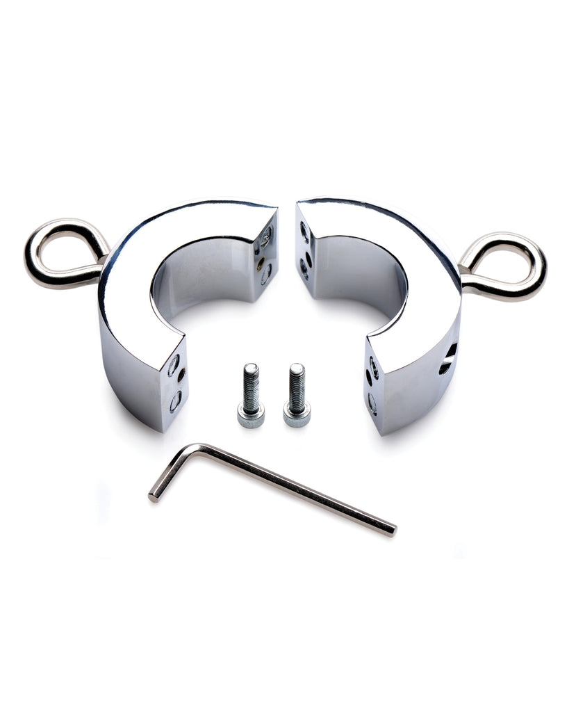 Indulge in intense ball-tugging play with the Ball Trap! Bring some heavy metal to your naughty activities and feel the satisfying stretch from this weighty ring. Designed to pull down on your sack with 11.6 ounces (220 grams) of weight, this metal ball stretcher is crafted for BDSM enthusiasts with a penchant for testicular play.Featuring two attachment points for additional accessories, this Ball Trap is the perfect foundation to base your scene for the night. Punish your sub for his bad behavior with additional weights or chains connected to some ankle cuffs and force him on his knees!Allen wrench included to undo and secure the screws holding the two halves of this ring together. The aluminum alloy material is easy to clean before and after use.