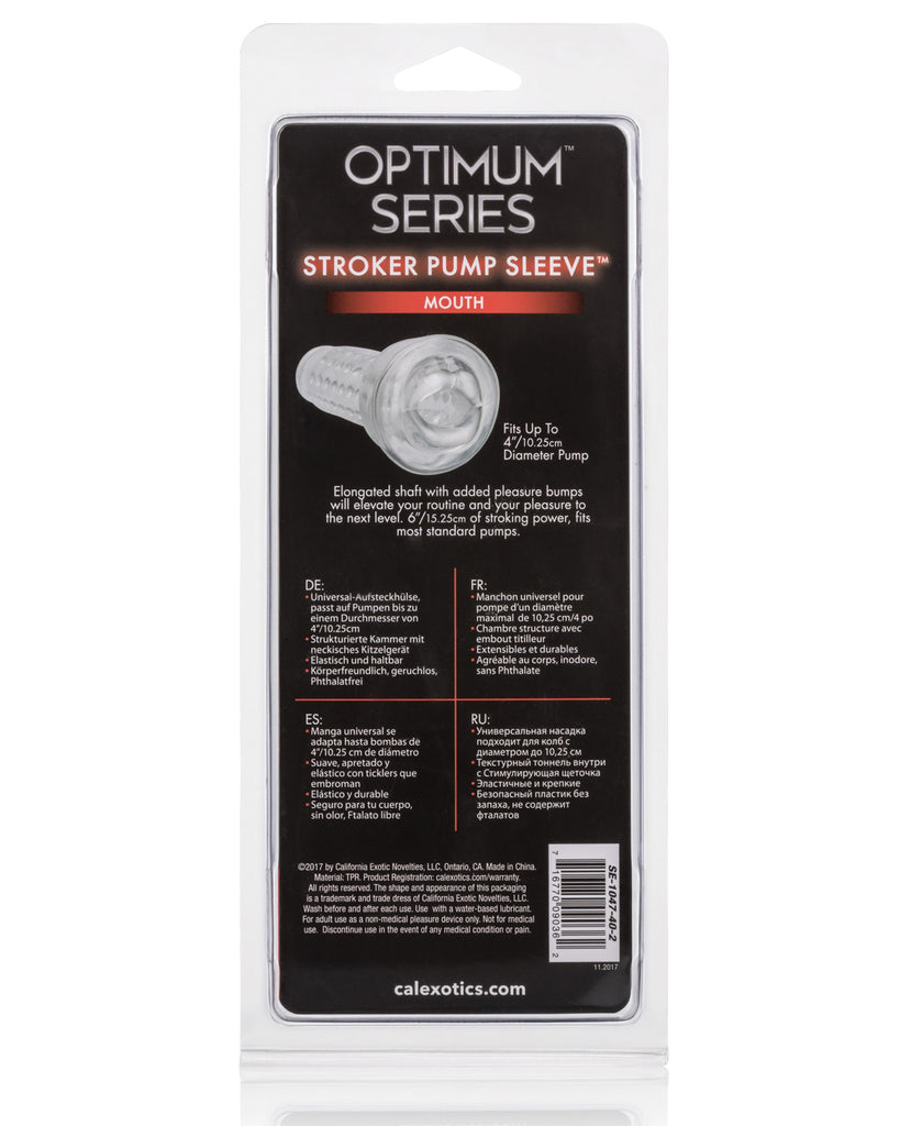 Ready for an ultra-comfortable pumping session or would you rather indulge in a some sensational solo play? Whatever youre craving, the Optimum Series Stroker Pump Sleeve is ready to take your pleasure to the next level. This ultra-stretchy, mouth-shaped sleeve has an elongated shaft and rows of stimulating beads for an intense masturbation experience with truly explosive results. The premium sleeve fits into most standard pumps, but can be used independently for a passionate stroking experience. The premium TPR masturbation toy is a body safe, unscented and phthalate free to keep you most sensitive spots, happy and healthy. Enjoy easy clean up with this maintenance free masturbation sleeve, simply wash with soap and warm water before and after each use. Use ample lubricant for easy insertion.