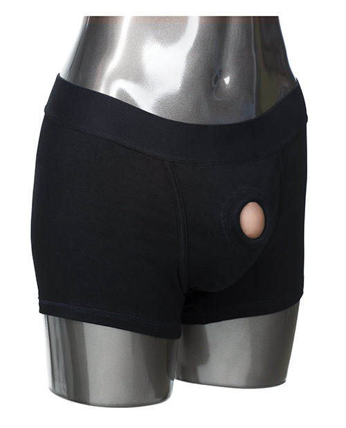 Offering superior support and comfort, the Packer Gear Black Boxer Harness is designed for the ultimate instyle and comfort when fashioning your favorite packer orstimulator. The masculine cut brief has a fashionable classic boxer style, with internal pockets to store your favorite vibrating stimulator. Insert a packer, probe or dong, into the reinforced panel O-ring, and get ready to enjoy sensualand mind-blowing one-on-one action. The Packer Gear Black Boxer Harness is made from washable soft, stretchy cotton/spandex and has an extra wide waistband for additional comfort and support. The boxers soft lining features discreet internal pockets and an internal strap to secure your preferred packersecurely in place. The reinforced 2-panel design also has a super stretchy O-ring that easily accommodates most standard sizes of erotic and exotic probes. The boxer harness delivers hands-free satisfaction every time. Ideal for first time and experienced users, the Packer Gear Black Boxer Harness requires no external strap adjustments. The boxer shorts slip on like underwear for an ultimate comfort fit. To experience orgasmic hands-free penetration simply select your favorite packer or dong, and pair up with a vibrating stimulator for double the ecstasy and unforgettable fun.