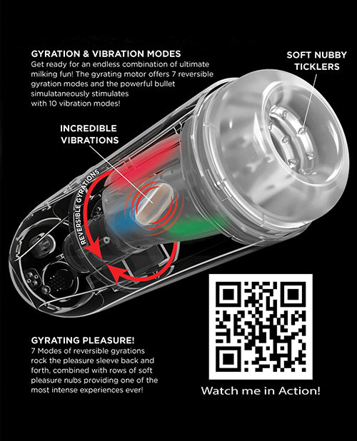 Introducing the first-of-its-kind milker masturbation technology designed to fully surround your shaft with vibrating, gyratory stimulation for the ultimate self-pleasure experience! A transparent window allows you to view the action as every inch of your cock is milked over and over by 7 revolving, gyrating functions, plus 10 vibration modes, all powered by a convenient rechargeable motor. The internal multi-ribbed TPE sleeve is lined with incredibly satisfying textures to enhance gyrational pleasure and features a powerful vibrator at the tip to further intensify the stimulation. To enjoy fully automated gyrational masturbation, simply press the button to initiate active milking power. Sexy, breathy moans can also be activated for intensified erotic excitement! Explore your options! The sturdy exterior case with an adjustable, locking suction cup can be set to your preferred hands-free position, or remove the interior TPE sleeve for hand- held pleasure. Care Instructions - Rechargeable via the included USB cord. The sleeve is removable for easy cleaning. Cleanup is a snap after the fun with antibacterial cleaner and warm water. Do not submerge the Ultimate Milker 2 in water. If desired, use a water- based lubricant like Moist with this product. PACKAGE CONTENTS :(1) Ultimate Milker 2.(1) Soft Nubby Sleeve.(1) Storage Cap.(1) Suction Cup Base.(1) Set of Ear Buds. (1) USB Charging Cord. PRODUCT SPECS: Total Length: 10.6 in (27 cm) Total Width: 3.3 in. (8.4 cm) Insertable Diameter: 2 in. (5.1 cm) Insertable Length: 5 in. (12.7 cm) Materials: ABS Plastic & TPE. IPX Rating: IPX4. CHARGING INFO : Charge Time: 4 hrs. Run Time: 120 min, Charger Type: Magnetic One Year Warranty.
