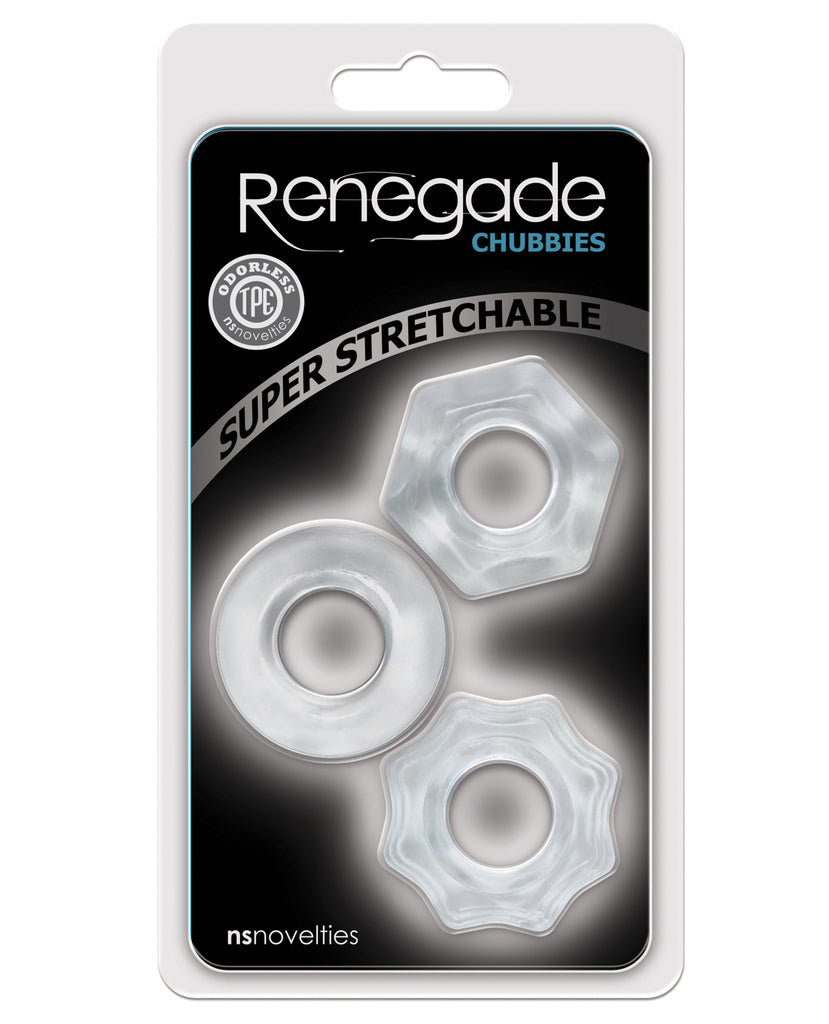 Stay up all night with Renegade Chubbies - a three-piece set of comfortable, stackable cock-rings made of odorless and pliable TPE! Each set of rings is super-stretchy with a unique design and are available in blue, black, and clear. Keep control of your climax and prolong your pleasure!