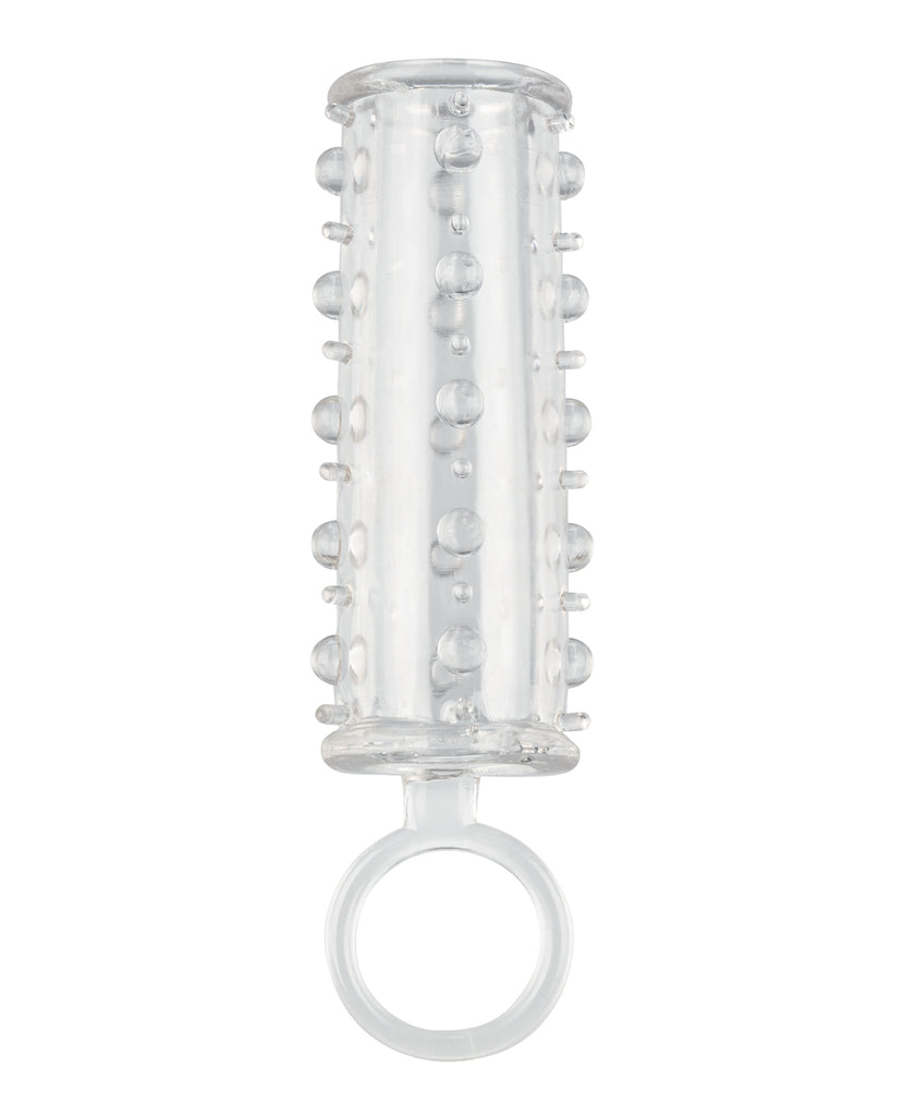 The Sensation Enhancer is a super tight, open-end extension sleeve with a sensually beaded shaft. The super sized enhancer wraps tight around your pleasure tool to increase girth, length and pleasure. While you thrill your lover with increased girth and stimulating beads, the fulfilling enhancers powerful erection support and open end design results in explosive results for both of you. The erotic enhancer sleeves ultra stretchy material and spacious chamber is made to fit even the biggest man. The textured chamber and built-in scrotum strap provide increase stimulation and powerful support. Wrap your pleasure tool in this super stretchy sleeve to easily increase stamina, stimulation and orgasmic pleasure. The flexible enhancer is made from a hygienically superior TPE. This body safe material is unscented and phthalate free to keep your most sensitive spots happy and healthy.