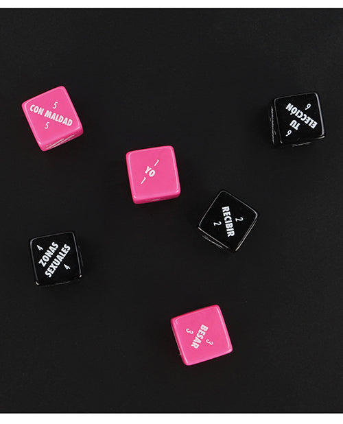 Let the Sexy 6 Dice dictate your foreplay fate . Now in Spanish! With 720 possible outcomes you can be sure to keep variety and spontaneity alive in your relationship Feel the anticipation build as you roll each dice in turn to gradually reveal the formula for your fun Die 1: Will it be you or me in the hot seat.Die 2: Will we be giving or receiving the treat.Die 3: What foreplay fun is to be done?Die 4: What body part is to receive the love?Die 5: How will the pleasure be given?Die 6: Where will the Magic happen? All that's left for you to decide is how many times do you want to play!