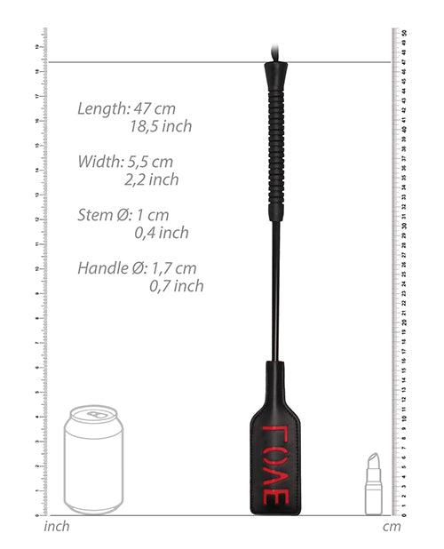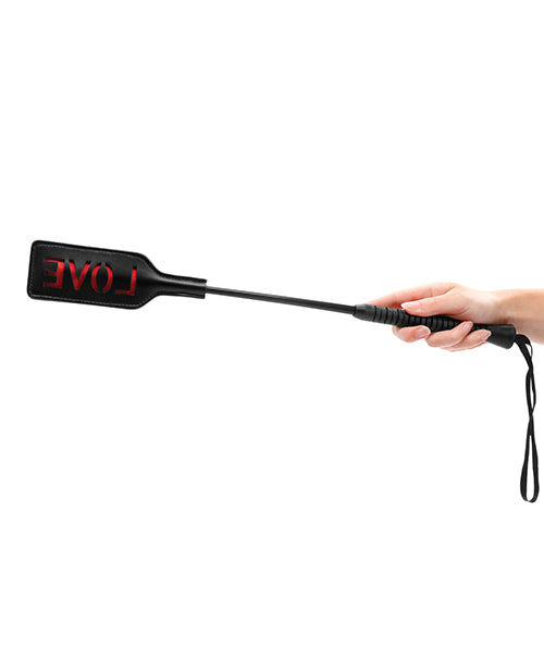 Leave a lasting impression on your partner. This short handled rectangular shaped crop is the perfect way to discipline your partner. Leave a lasting impression on your sub. The word LOVE is reversed so it will show up on their skin. Materials: Faux Leather. Dimensions: Length - 18.5 inches. Width - 2.2 inches. Stem - .4 inches. Handle - .7 inches.