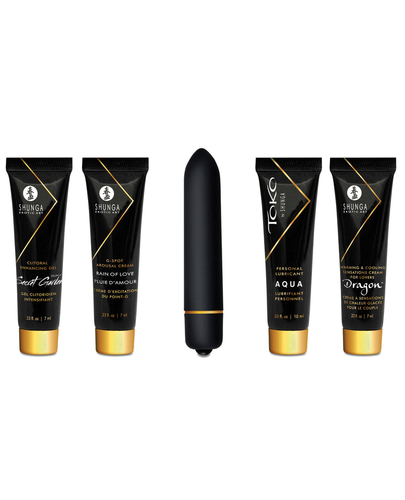 Explore your Naughty Side. This collection of miniature products will help you explore and break all taboos. Nothing surpasses the desire to discover the lust of flesh by yourself or with your lover. Collection includes: Toko aqua personal lubricant, Secret Garden clitoral enhancing gel, Dragon warming and cooling sensations cream, Rain of Love G-spot arousal cream, 10 speed vibrating bullet ( requires 1 AAA battery - not included)