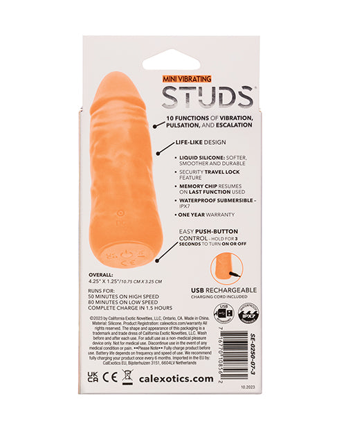 Enjoy powerful pleasure in a small package with the Mini Vibrating Studs, a compact yet formidable 4.25"/10.75 cm liquid Silicone vibe. This stud is the perfect blend of life-like design and potent sensation. This sleek companion comes equipped with 10 intense functions of vibration, pulsation, and escalation, each providing an intense sensation. Whether you crave a gentle rumble or a powerful quake, the varied settings cater to every preference, ensuring a deeply personal and satisfying experience. Crafted from Liquid Silicone, the mini vibe is made for comfort and durability with a soft and smooth texture. The body-safe and 100% waterproof design with an IPX7 rating allows for adventurous play in any setting, inviting you to explore new dimensions of pleasure in the bath, shower, or wherever the mood strikes. The state-of-the-art memory chip thoughtfully resumes on the last function used, offering an effortless return to your favorite setting. With user convenience in mind, the device incorporates a security travel lock feature, activated with a three-second hold, ensuring your intimate endeavors remain discreet. USB rechargeable and accompanied by a charging cord, it boasts a rapid full charge in just 1.5 hours, delivering 50 minutes of high-speed bliss or an extended 80 minutes of enjoyment at a more leisurely pace. The Mini Vibrating Studs offers deep satisfaction in a life-like, compact design you have to try for yourself.