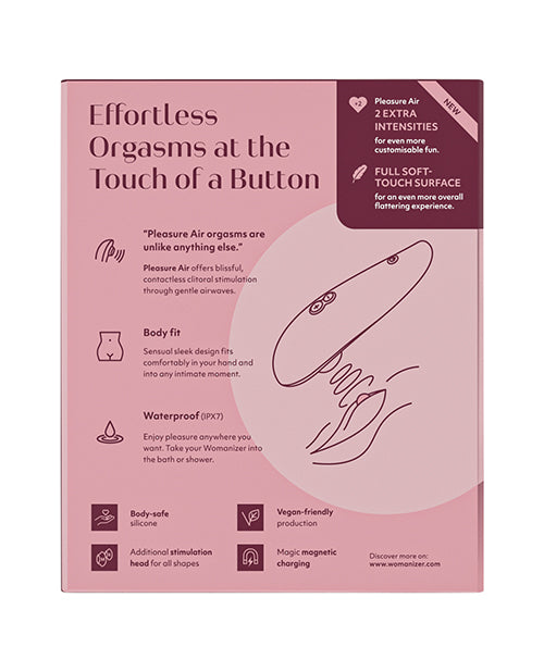 Simple and efficient, Womanizer CLASSIC 2 uses our ground-breaking, original Pleasure Air technology to offer effortless orgasms in record time. 10 Intensity levels - Whether you prefer soft and gentle or powerful and intense, or something in between your next orgasm is just the push of a button away. The intensity levels are perfectly balanced and offer the right setting for your every mood. Afterglow - By short-pressing the power button, your toy quickly reverts to its lowest setting for a relaxing end to an orgasm. Extra Stimulator Head - We know that every body is different and beautiful! For this reason, every box includes two sizes of stimulator heads to ensure that everyone can enjoy their WOMANIZER.