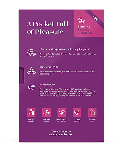 Compact sized clitoral stimulator for people seeking the unique sensations of Pleasure Air Technology. The new Womanizer STARLET 3 its the original Womanizer Pleasure Air Technology combined with five new vivid product colors and two more intensity levels, while its still waterproof and USB rechargeable for a reasonable price. 6 intensity levels - Every orgasm is unique. That's why six different intensity levels guarantee perfect pleasure exactly when and how you want it. The intensity levels are perfectly balanced and offer the right setting for your every mood. Body fit - The sensual, slim design fits comfortably in your hand and becomes the perfect companion for even the most intimate moments.IPX7 Waterproof - You want to dive deeper? Since your WOMANIZER is IPX7 waterproof, nothing stands in the way of a long, relaxing bath, a refreshing shower or even a pool party. Materials : ABS plastic made without phthalates, BPA or latex. Dimensions : 117mm x 46mm x 47mm USB rechargeable - Run Time : 30 min Charge Time : 30 min Five Year Warranty.